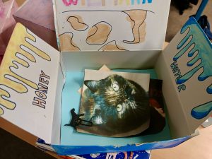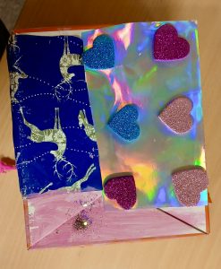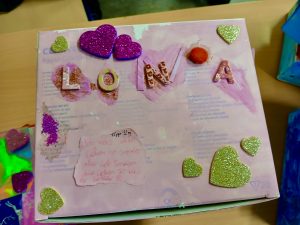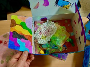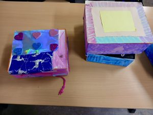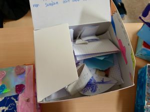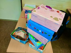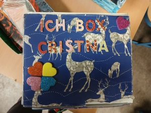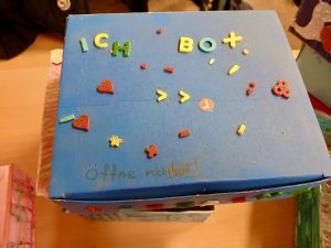 Das Erstellen von Ich-Boxen ist hierbei eine der Aufgaben mit denen sich die Schülerinnen und Schüler der Klasse 5a im Fach Philosophie beschäftigten. Die Ich-Boxen sind individuell gestaltet und ihr Inhalt und Design drücken das Selbstbild der Schüler und Schülerinnen aus. Innen befinden sich neben Bilder oder kleinen Gegenständen, die für die jeweiligen Jugendlichen wichtig sind, auch Briefe an sich selbst und Ideen, wie sich sie ihre Zukunft vorstellen und wünschen. So ist die Ich-Box gleichzeitig auch eine Zeitkapsel – geöffnet werden die Boxen dann zum Abschluss in der Klasse 10. (Axel Braun)